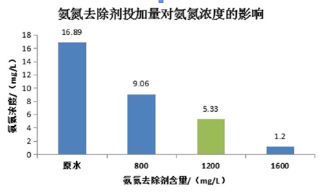 通過小試數據,氨氮的去除率隨藥劑投加濃度的增大,含量越來越低,呈線性關系,去除效果良好。當氨氮去除劑投加量為 1200mg/L時,出水氨氮濃度為5.33mg/L,可達標排放。