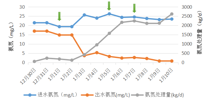 處理效果:菌劑投加4日后生化系統(tǒng)恢復正常,10天調試氨氮穩(wěn)定達標,生化系統(tǒng)恢復運行。