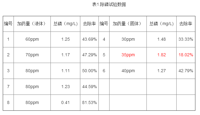 根據藥劑的有效成分,固體除磷劑的有效含量是液體除磷劑的有效含量的2倍,因此對比試驗為驗證液體除磷劑2倍于固體除磷劑加藥量的有效去除率是否高于1倍固體除磷劑加藥量的去除率!
